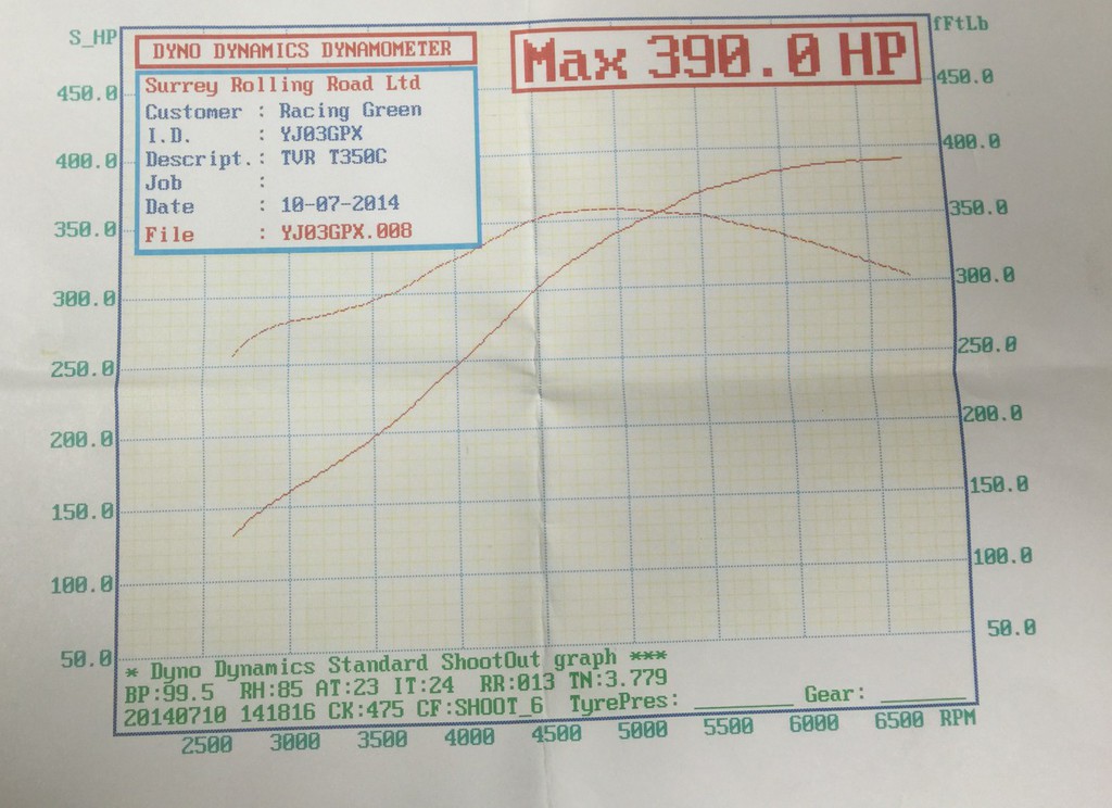 time gave 390bhp (290 kW) and 360ft lbs of torque at the wheels (please see screen shot of the dynamometer sheet).