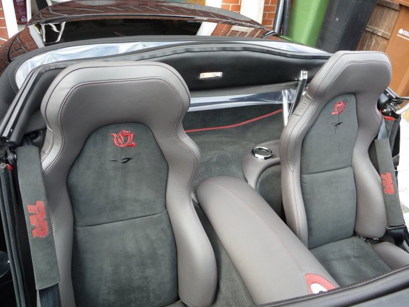 - Seats trimmed in fine warm charcoal leather with slate black charcoal alcantara inserts and Red Rose emblem embossed into both seat faces.