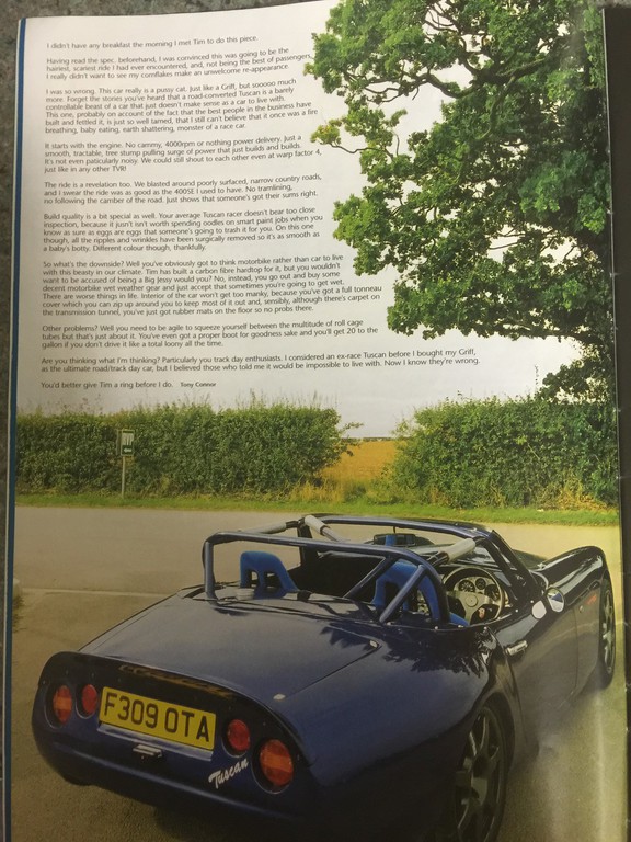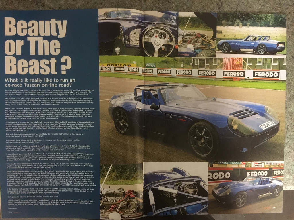 become one of a select few Tuscan Race Cars adapted for road use, in 2000/2001. It passed the first MOT in April 2001 and was DVLA registerd in July 2001.
